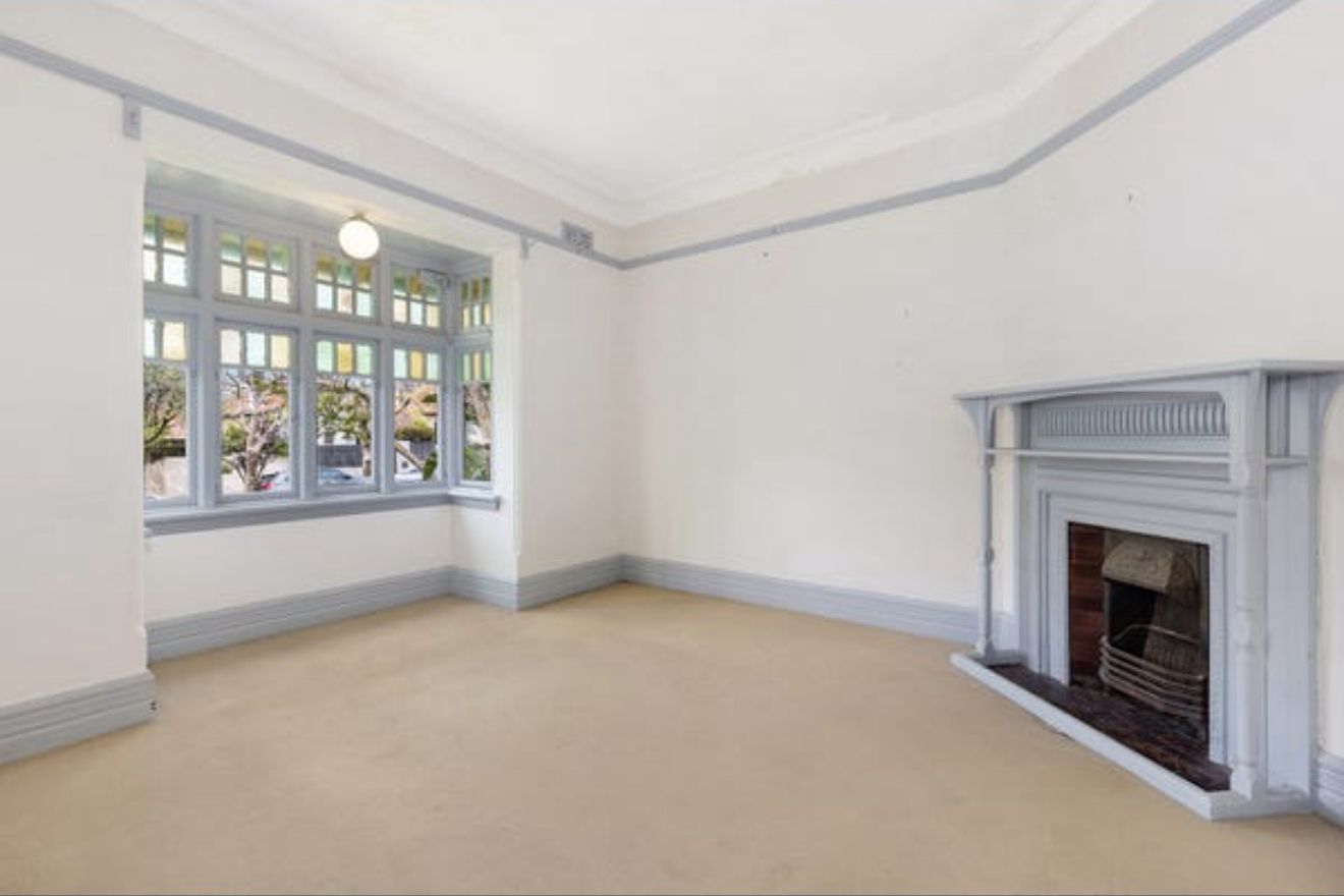 BeforeAnother angle of the heritage room showing leadlight bay window, decorative ceiling border, original period fireplace and cream carpet awaiting transformation.